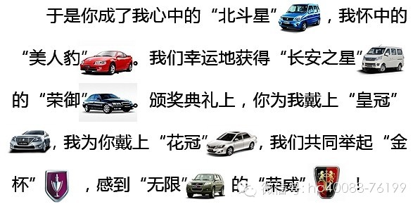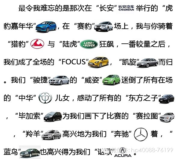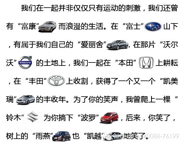 我们在一起并非仅仅只有运动的刺激,我们还曾有“富康”而浪漫的生活。在“富士”山下,有属于我们自己的“爱丽舍”,在那片“沃尔沃”的土地上,我们一起在“本田”上耕耘,在“丰田”上收割,获得了一个又一个“凯美瑞”的丰收年。为了你的笑声,我曾爬上一棵“铃木”为你摘下“波罗”,后来,你笑了,树上的“雨燕”也“凯越”地笑了。