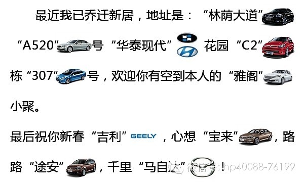 最后祝你新春“吉利”,心想“宝来”,路路“途安”,千里“炫逸”!