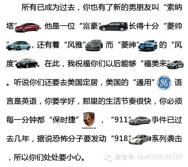所有已成为过去,你也有了新的男朋友叫“索纳塔”,他是一位“富豪”,长得十分“菱帅”,还有着“风雅”而“菱绅”的“风度”。在此,我祝福你们以后能够“福美来”。听说你们还要去美国定居,美国的“通用”语言是英语,你要学好,那里的生活节奏很快,你必须每一分钟都“保时捷”,“911”事件已过去几年,据说恐怖分子要发动“988”系列袭击,所以你们处处要小心。