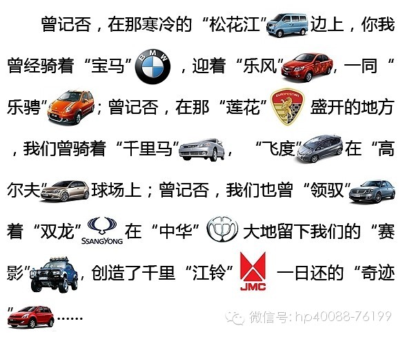 曾记否,在那寒冷的“松花江”边上,你我曾经骑着“宝马”,迎着“乐风”,一同“乐骋”;曾记否,在那“莲花”盛开的地方,我们曾骑着“千里马”,“飞度”在“高尔夫”球场上;曾记否,我们也曾“领驭”着“双龙”在“中华”大地留下我们的“赛影”,创造了千里“江铃”一日还的“奇迹”……