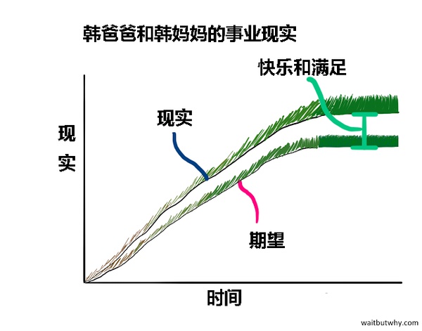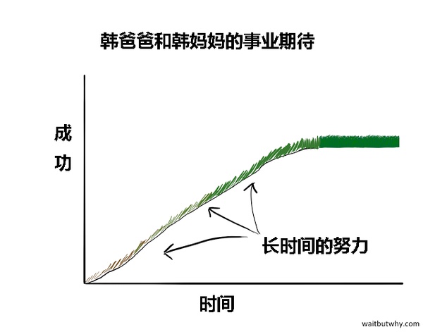 韩爸爸和韩妈妈们从小被告知,只要他们踏实、苦干,他们就能获得这片绿色的草坪,当然他们需要长时间的勤奋工作才能达到这一切。下图的纵轴代表成功,横轴代表时间,在韩爸爸和韩妈妈心中,他们对于成功的期望是包括了一个长时间的努力过程的。