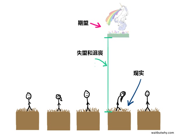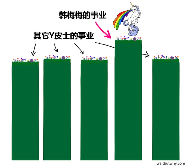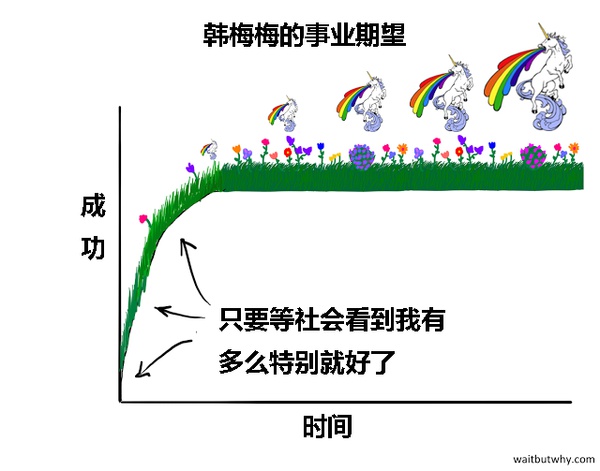 与此同时,另一种错觉伴随着Y皮士们开始工作而产生。韩爸爸和韩妈妈们的期望是通过他们多年的勤奋努力,他们能收货一个成功的事业。但是在韩梅梅看来,对于自己这样一个特别的来说,一个成功的事业是注定了的。她在开始工作之前对于事业的期望是这样的: 可惜的是,社会不是那么容易混的,而要收获一个成功的事业其实是相当困难的。成功的事业需要很多年的辛酸、努力和泪水来打造。即使是当下最成功的那些人,在他们20几岁的时候大部分也是没什么大成就的。
