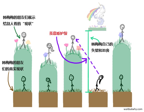 这使得韩梅梅产生了一种错误的认知,觉得别人都过得很好,这使得她更觉得自己过的糟糕: 这就是为什么韩梅梅过得不快乐、不满足。其实她的事业起步可能很正常,但是对她来说却是很失望的。